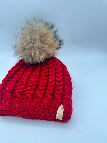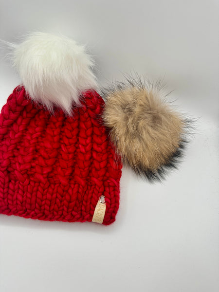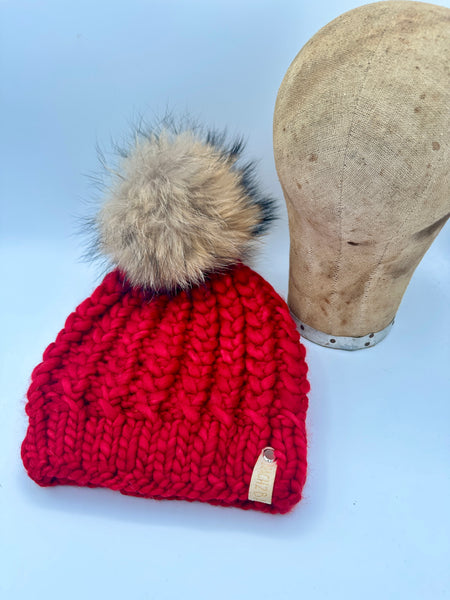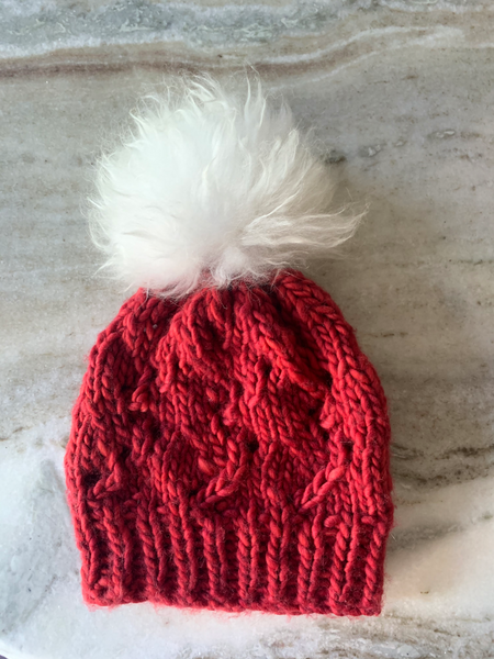 This hat is the perfect Christmas red! Top it with a white pompom and you'll be ready for the holiday season. The best part? Purchase a second pompom in "Natural" and you'll have a hat to wear all winter long! One hat=two looks!
